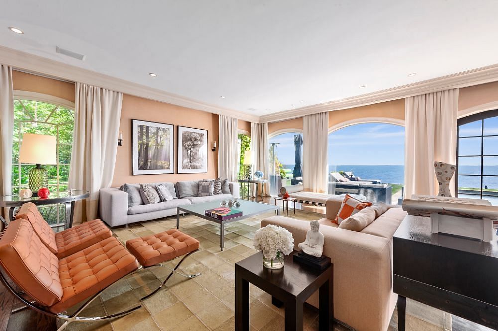 On one side of the foyer is a private den, while an oversized living room is on the other. The living room features a corner fireplace and opens to the well-appointed dining room, both of which have a spectacular water view thanks to a wall of curved windows. A glass door leads to a 45-foot terrace that runs along the side of the house and overlooks the 18-by-36-foot waterside pool.