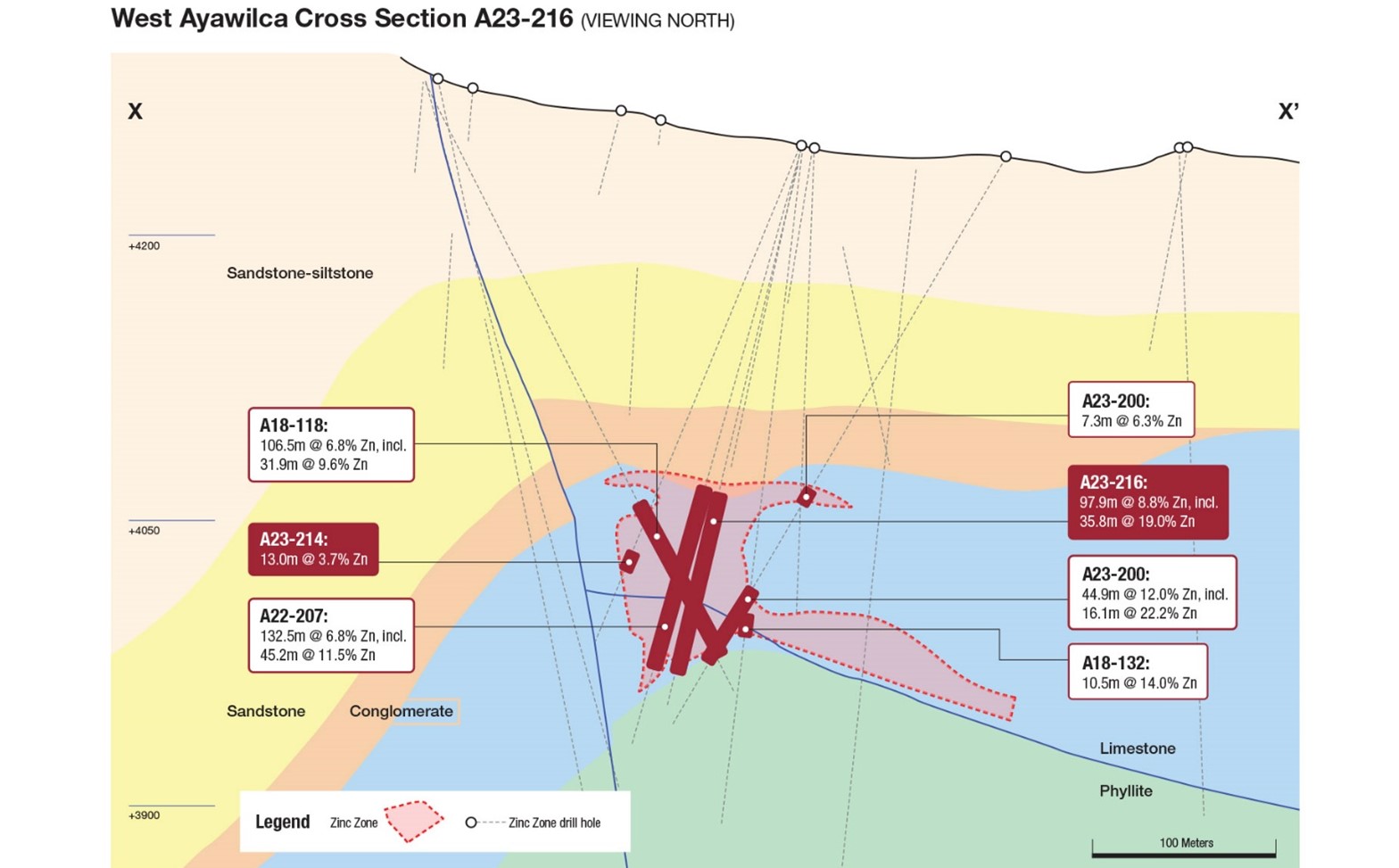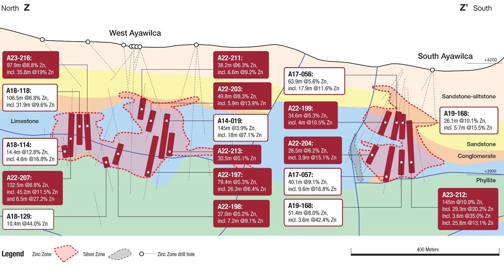 "We have confirmed at West Ayawilca that two pipe-like sulphide bodies hosted by brecciated limestones extend through the 100-200-metre-thick limestones and are connected by massive sulphides at the base. At South Ayawilca, very high-grade massive sulphide zinc mineralization is concentrated in a folded limestone at shallower depth - this discovery has the potential to be a ‘starter mine' which could provide early payback."