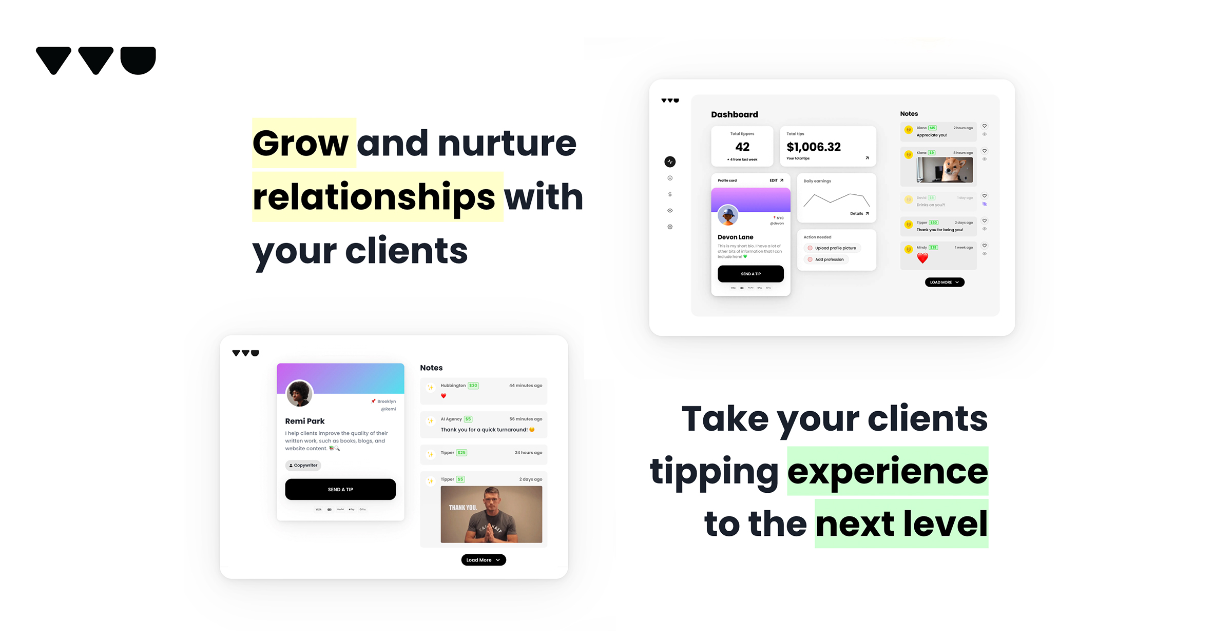 The process of sending a virtual tip is also a delightful experience for tippers. When sending a user a tip, tippers are presented with a simple 1-click payment flow. The tipper has several payment methods to choose from based on their device, such as Apple Pay, Credit Card, PayPal, and more. Along with sending a tip, tippers can also leave a personalized message. These 'tipper notes' are displayed publicly on the users tip page, making the experience more interactive. Users can grow their community and receive payments at tiptopjar.com.