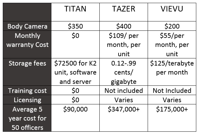 Titan’s new take towards body cameras and body camera storage has provided police with a new way to combat high monthly cost and makes sure that every officer has the equipment that is needed. With this new technology it comes to only a matter of time before departments who are paying those high monthly cost jump ship to a friendlier and cost efficient method.