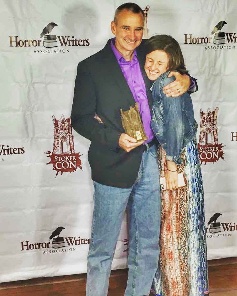 “As a writer, I should be able to express my joy at receiving the Stoker Award, but I simply cannot put it into words. It is the culmination of a lot of hard work and incredible support. I am honored to be recognized by the HWA [Horror Writers Association] and blessed that my wife and daughters were on hand to celebrate the moment with me,” says Deady.