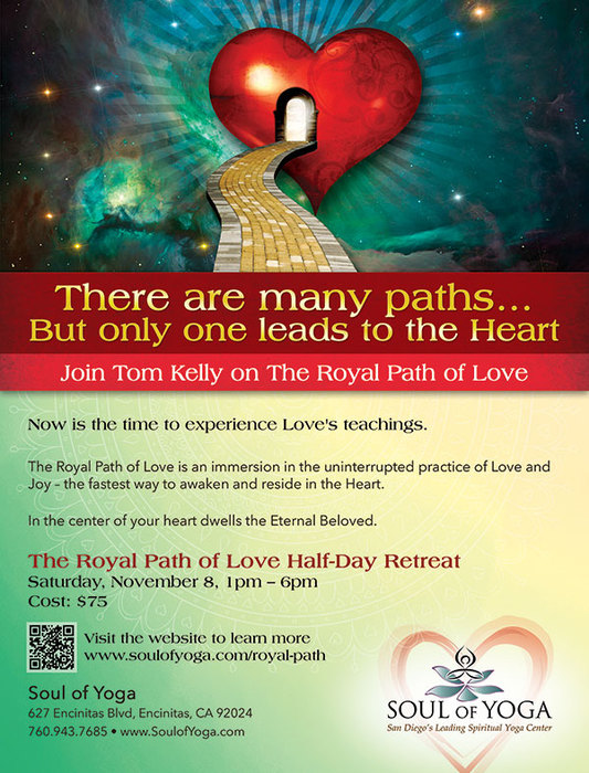 Encinitas, California, October 22, 2014 (Newswire.com) - Learn to live every moment in LOVE and JOY at this half day retreat, "The Royal Path of Love," Saturday, November 8th, 1pm-6pm, $75 at The Soul of Yoga, 627 Encinitas Boulevard, Encinitas, CA. http://soulofyoga.com/spiritual-programs/the-royal-path-of-love
