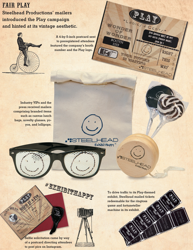 The final mailer, sent two weeks before the show, contained one carnival-themed ticket good for a game of ring toss, and another for a fortune-teller in the upper level of Steelhead’s exhibit. Members of the tradeshow media also received a package with a letter explaining the theme, a branded canvas lunch bag, novelty glasses, lollipop and wooden yo-yo.