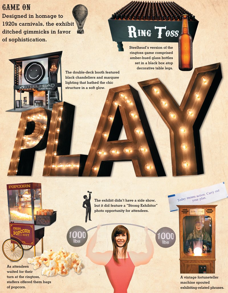Steelhead decided to create an eloquent vintage carnival scene, complete with an old-fashioned ring toss game for prizes that included branded wooden yo-yos, Bluetooth speakers, and novelty glasses. The upper level of the exhibit included a fortune-teller (anyone remember the movie “Big”)?