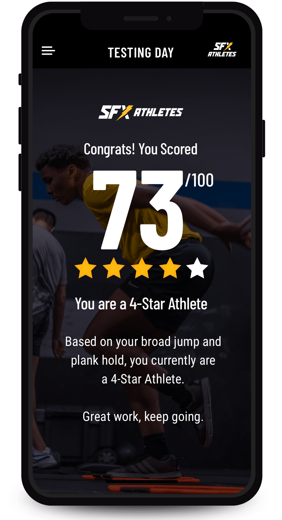 After athletes sign up for the app, they are provided a custom training plan based on their measurements and a strength test. The test measures the athletes' broad jump distance and plank hold time. With user-specific information, the app uses its algorithm to generate their SFX Score. The SFX Score gives athletes a star-level ranking 1-5 based on the metrics and standards of the SFX system developed through years training athletes in person.