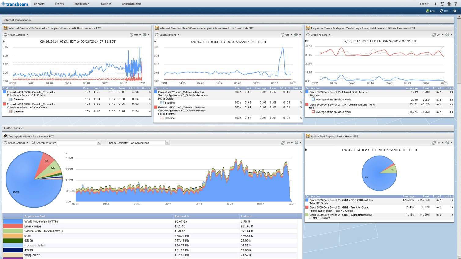 Transbeam’s Intelligent Network Monitoring enables you to obtain network analytics in real-time and diagnose issues before end-users experience any problems. The key benefits recognized by users include bandwidth utilization, packet loss, latency, alerting, dynamic baselines and ability to generate valuable quick reports -- leverage preconfigured reports, create templates, or generate ad hoc reports. The key features of this service include alerting on performance anomalies in advance of end user impact preventing any negative events that could impact your business, capacity network planning to manage bandwidth usage before issues arise and custom performance metrics or ability to collect customer performance indicators from any network device.