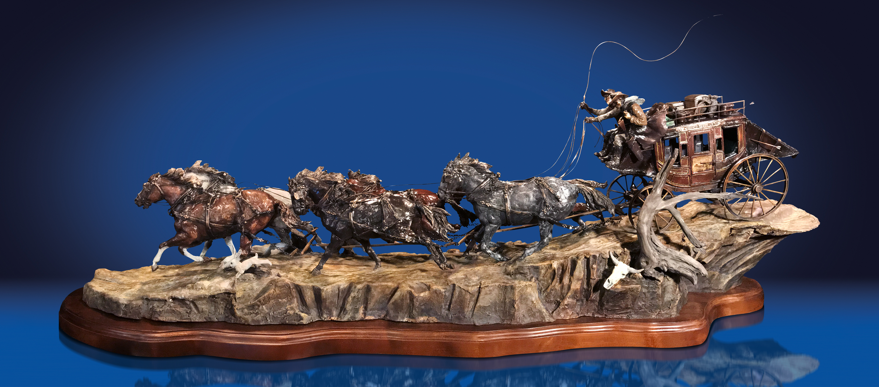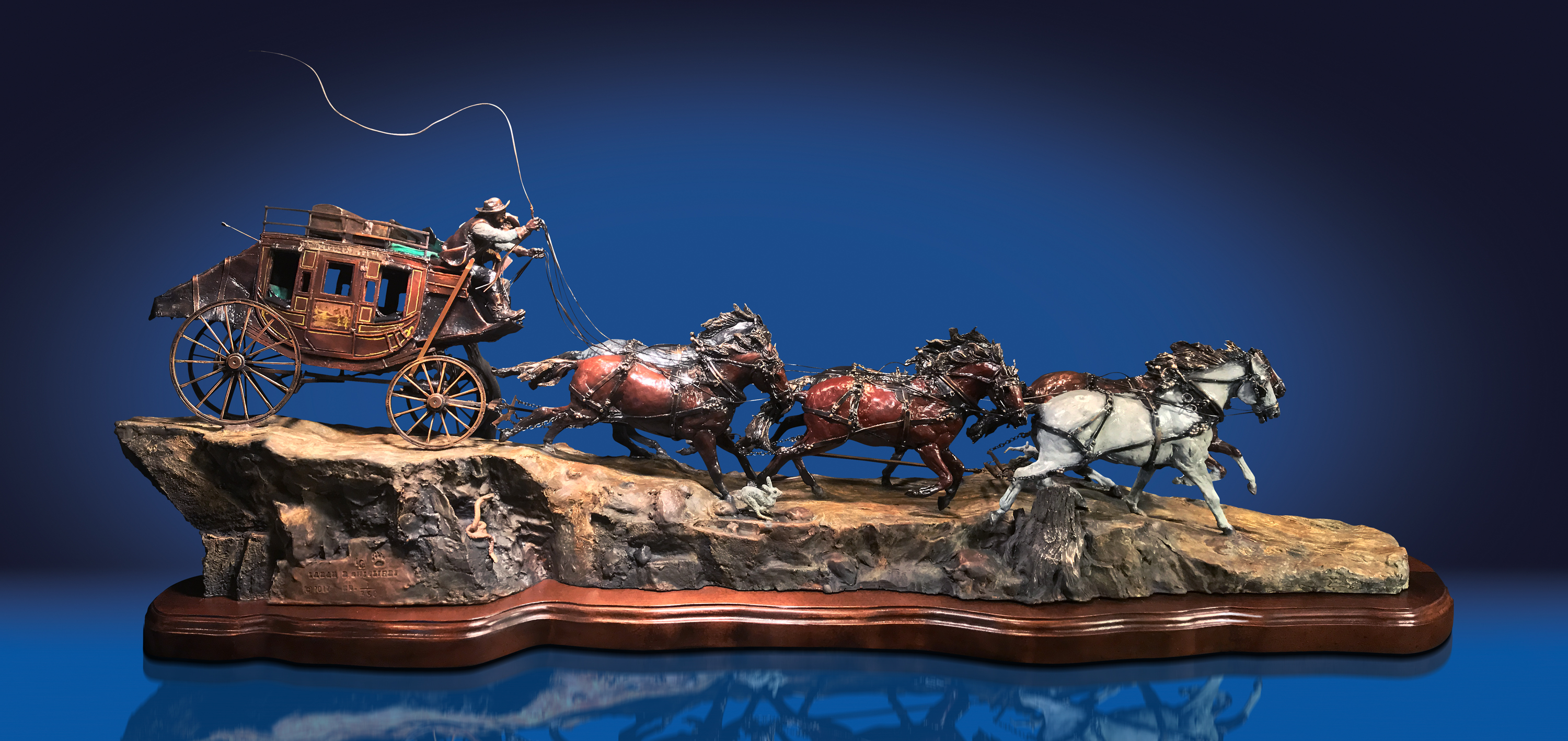 Stage Coach Gold was commissioned by Mark Russo to world-famous Laran R. Ghiglieri to create a historically accurate 1860s Concord stage coach. Cast using the traditional “Lost Wax Casting” process, in bronze, 210 pounds in weight, over five feet in length and 27 inches tall, it was created from over 3,000 individual pieces joined into one of the most detailed sculptures of its kind in the world today. Mark adds, “We think you’ll agree that this piece brilliantly represents the Wild West in its most recognized and iconic image. Cast in bronze, finished in a dark patina with hand-applied highlights, then hand-rubbed to enhance its incredible detail of not only the stage coach but the lifelike horses, each one unique. The details were sculpted following months of painstaking research from original blueprints of the Concord Stage Company archives.
