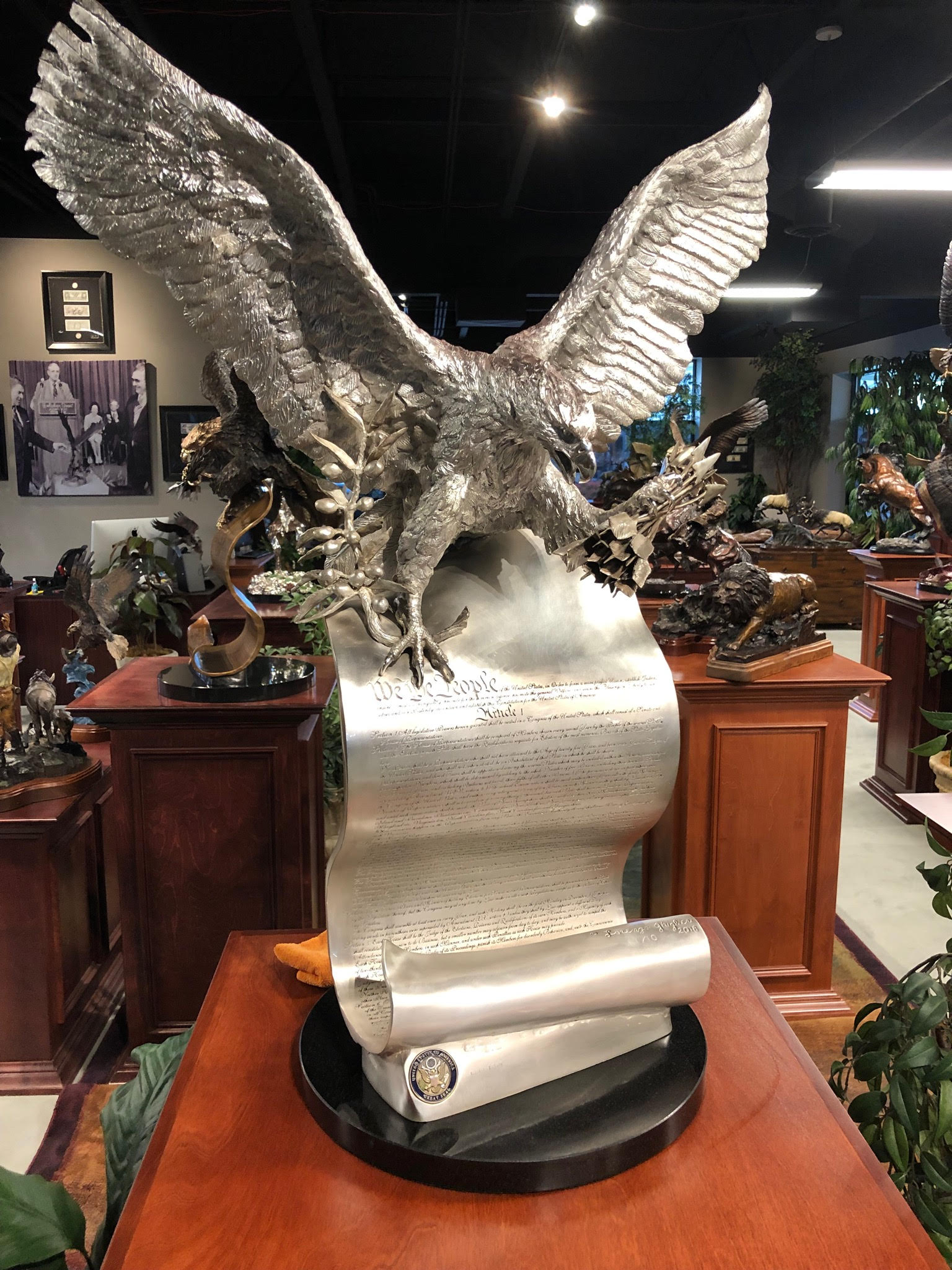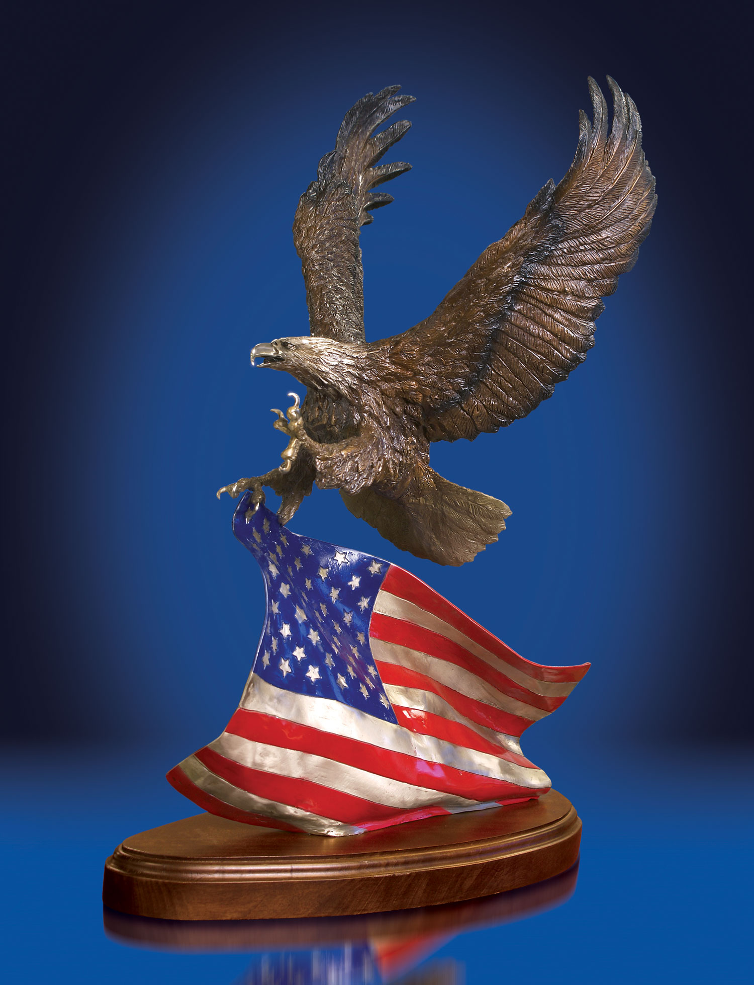 “Continuing in a patriotic theme, we will feature one of our most sought-after bronze sculptures, an inspirational figure depicting our country’s iconic Bald Eagle grasping our American flag in its talons. We’ve named it, ‘The Spirit of America.’”