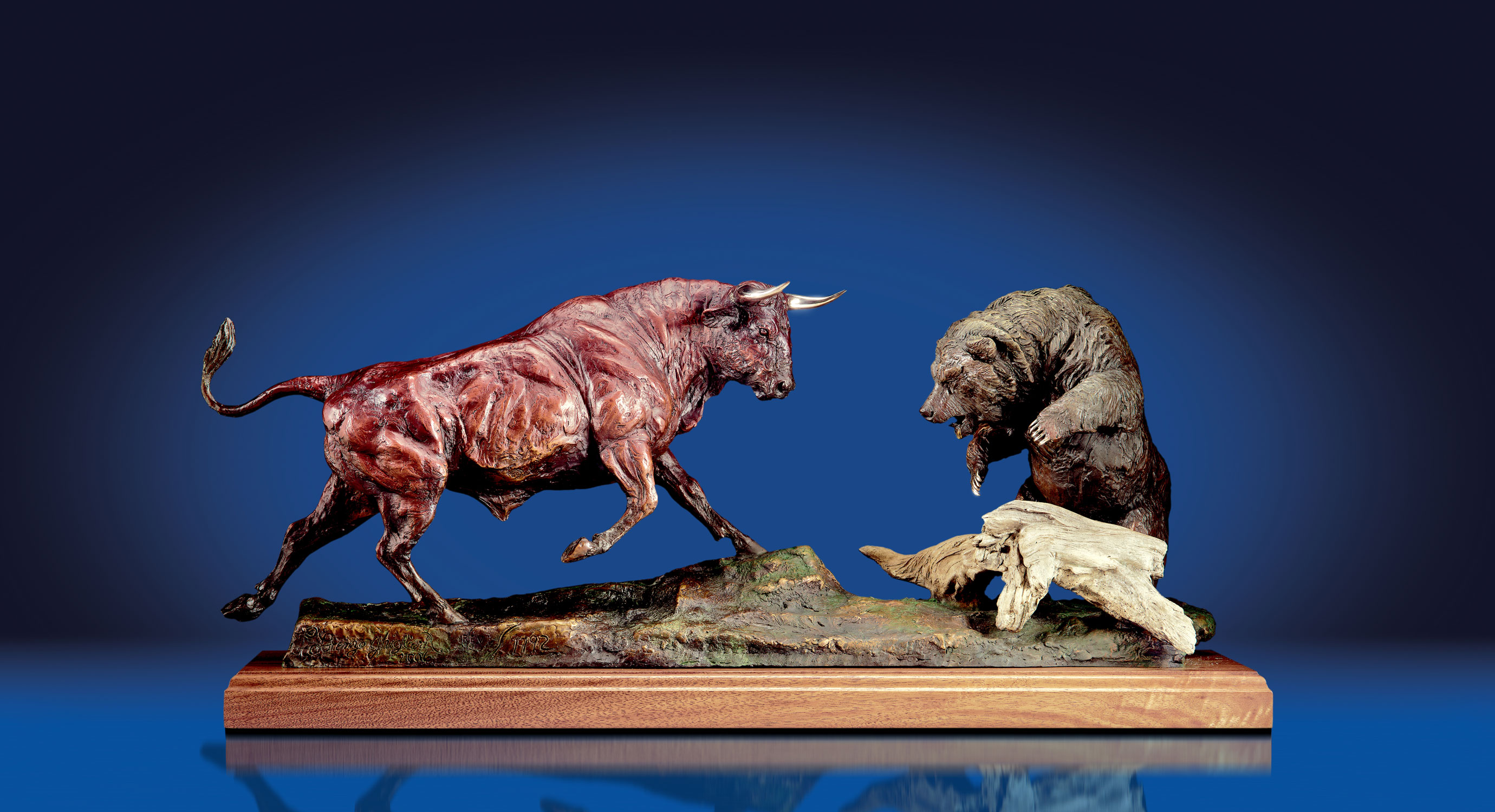 “Befitting the MoneyShow theme, a sculpture we’ve entitled ‘The New Powerful Exchange’ will be prominently featured. It depicts the American Stock Exchange’s symbol, in a fierce confrontation between a bull and bear. During the California Gold Rush, miners used to actually pit bears and bulls together in a fighting ring. The bloody sport eventually was outlawed, but the symbolic strength of the two animals translated into modern Wall Street catchphrase, as the bull tends to slash upward and the bear strikes downward.