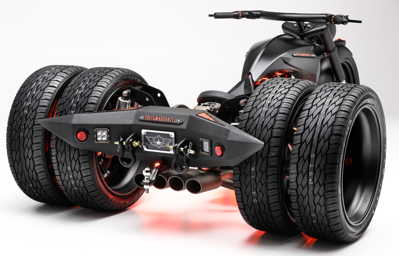 The MyTruckWarranty.com dually-trike, featuring oversized, dual rear wheels, a trailer hitch, and custom crash bars and floorboards aligns with the new brand’s focus on medium-duty commercial work trucks.