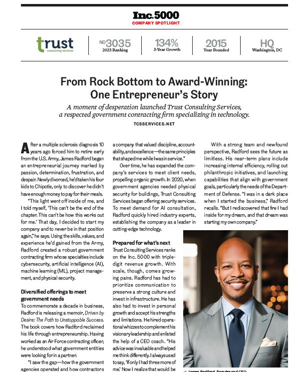 WASHINGTON, DC, November 4, 2025 (Newswire.com) - Trust Consulting Services, Inc. (Trust), under the strategic vision and leadership of founder and CEO JW Radford, is proud to announce its appearance in the Winter 2025/26 profile of the prestigious Inc. 5000 list of America's fastest-growing private companies. Trust achieved ranking No. 3035, a testament to its high-growth trajectory and commitment to excellence in the federal contracting and professional services arena.