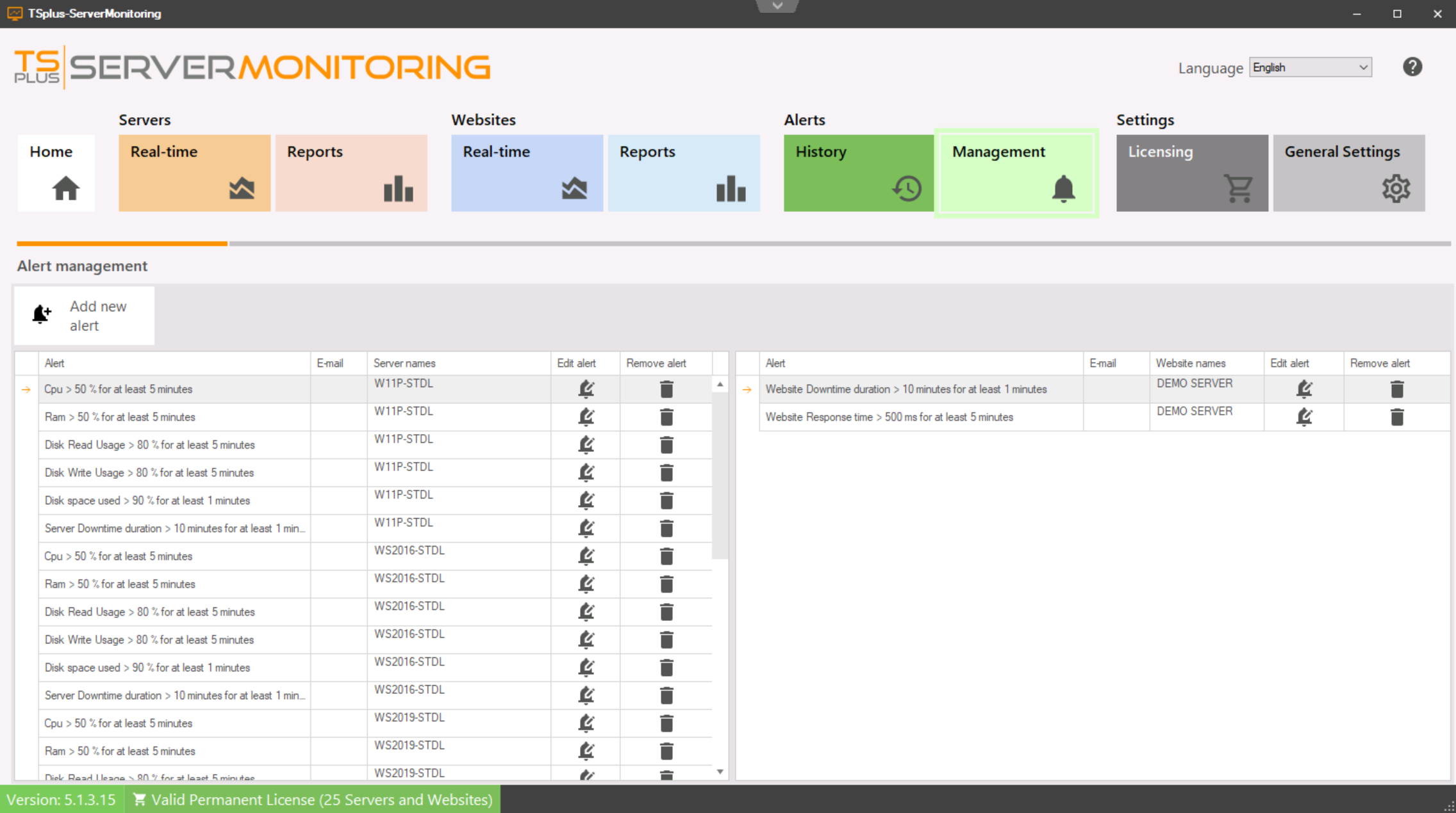 Server Monitoring includes an advanced alerts system and the ability to set customizable thresholds for target situations such as when the free Disk space reaches as low as 20%, or when a website's loading time is higher than 3 sec (see screenshot Alerts).