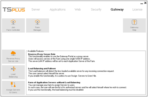 For sake of better clarity and consistency, the Gateway tab is organized in a different way. It now also displays the two Farm Manager tiles that could be found previously in the Server Tab. This change makes the navigation more handy and more logical.