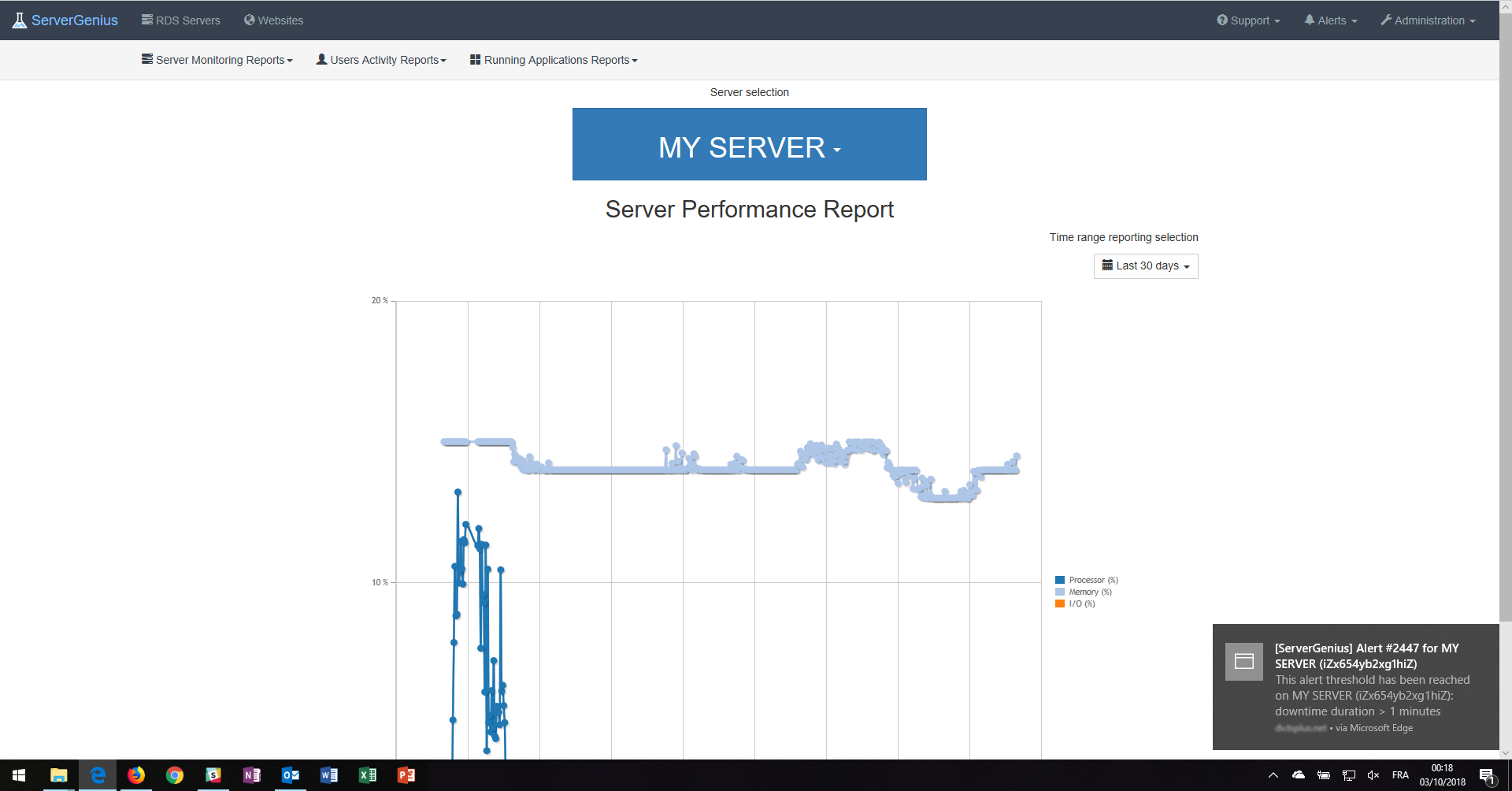 Server Genius installed on multiple servers continually monitors events and data. Designed for TSplus administration, it tracks and analyzes activity on websites and RDS servers to deliver smart graphs and accurate reports on their status.