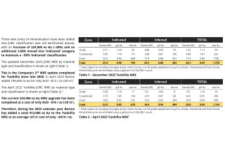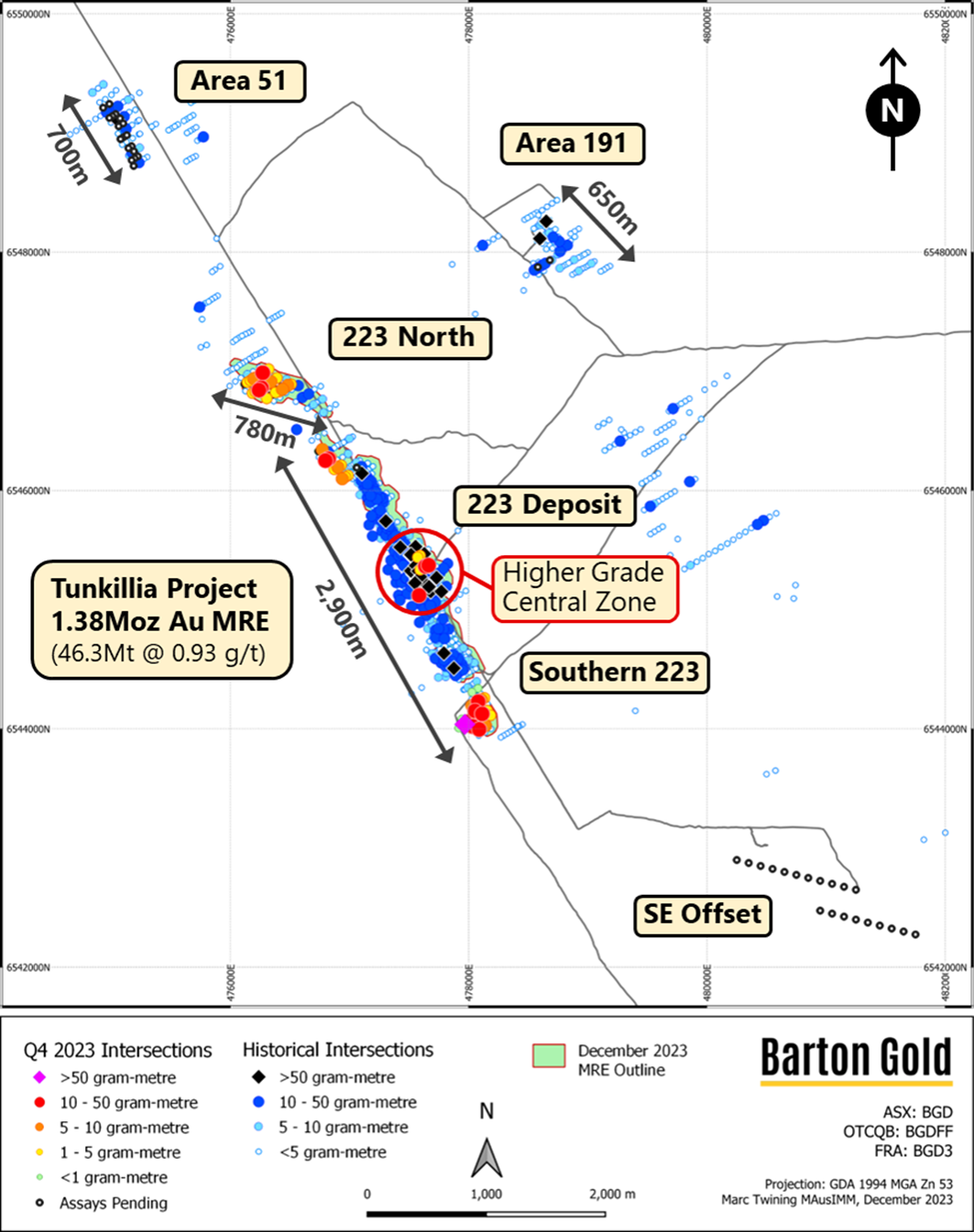 An updated Tunkillia plan map showing the updated December 2023 MRE outlines, and regional targets Area 51, Area 191 and SE Offset, is shown at Figure 1 below. The updated Tunkillia MRE includes a northern extension of the 223 Deposit, a new offset zone of mineralisation proximal to its southern extent of the 223 Deposit (Southern 223), and the conversion of the 223 North gold zone into JORC classification.