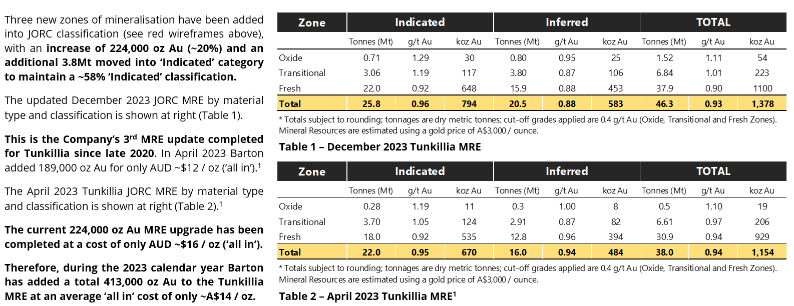 - Barton total JORC Mineral Resources increase to 1.46 million oz (47.2Mt @ 1.0 g/t Au), with 413,000 oz Au added during 2023 for an average ‘all in' cost of only AUD $14 / oz