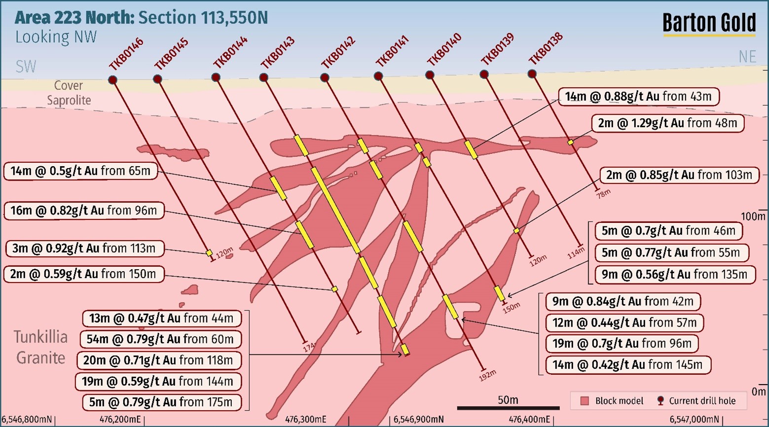 | TKB0142 | 145 | 159 | 14 | 0.42 | 1m @ 1.13g/t Au from 146m |