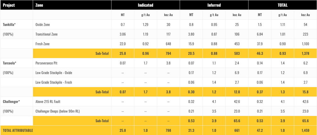 * Table shows complete JORC Mineral Resources Estimate (MRE) for each Project on a 100% basis. Figures subject to rounding; tonnages are dry-metric tonnes; all Mineral Resources classified as ‘inferred' are approximate; cut-off grades applied are 0.4 g/t Au (Tunkillia), 0.4 g/t Au (Tarcoola), 2.0 g/t Au (Challenger).