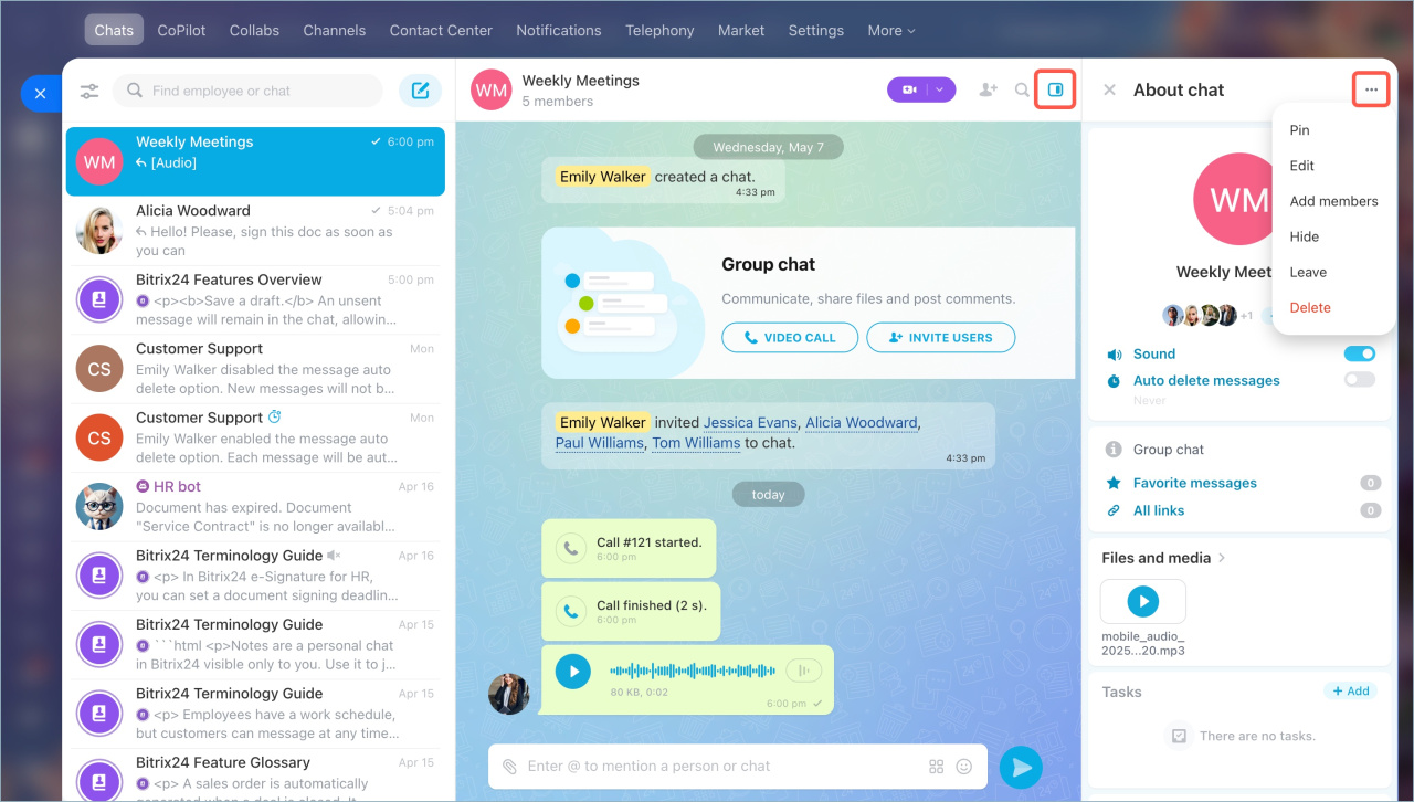 Bitrix24 Chat is built for real work, not just messaging. Voice messages and integrated calls help teams communicate faster when typing slows things down. Search tools and organized sidebars make it easy to find past messages, shared files, and important links. Teams can quickly catch up and move forward with confidence.