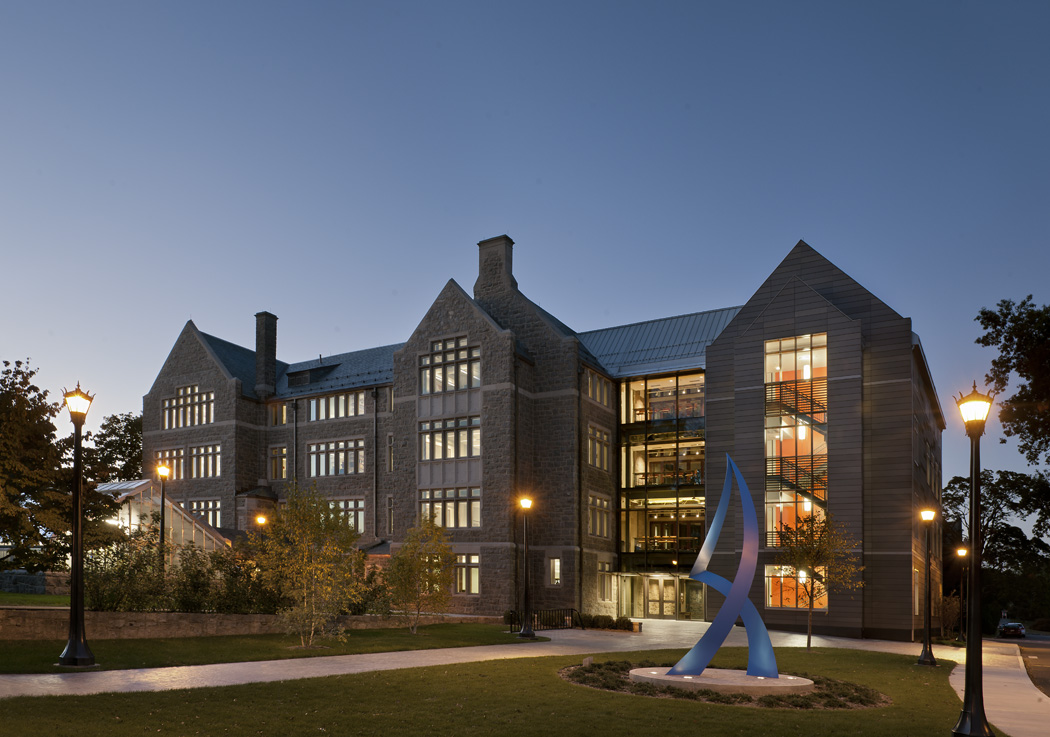 This $17.7-million project renovated and expanded New London Hall, the oldest building on the Connecticut College campus, to create a new graduate-level science facility with a collaborative space for teaching and research. The project included gut renovation of the four-story, 26,000 sq-ft structure and construction of a new 10,000 sq-ft, four-story addition. Designed by Payette Architects of Boston, the Science Building was initially planned for LEED-Silver certification, but was able to achieve LEED Gold.