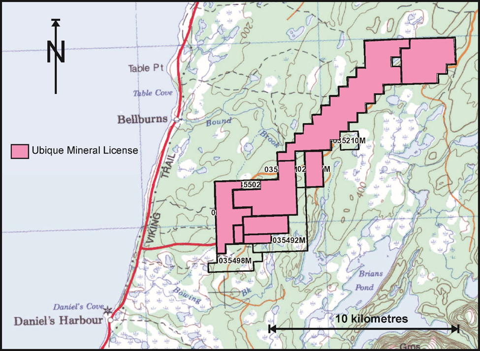 The Daniel's Harbour properties of Ubique cover both the area of the past producing high grade zinc mine and extensions of favorable areas, mostly to the north-northeast along strike for more than ten kilometers. Exploration drilling to date has confirmed three zinc deposits and has indications of two more which require additional definition drilling to define their extents. Several more zones identified by one or more historic drill holes require relocating and further drilling to confirm. As the deposits are long, narrow and flat lying-in shape and orientation, within flat lying dolomitic sedimentary rocks they may extend across more than one blocks of claims and therefore the ability to consolidate the property position will assist in exploration execution.