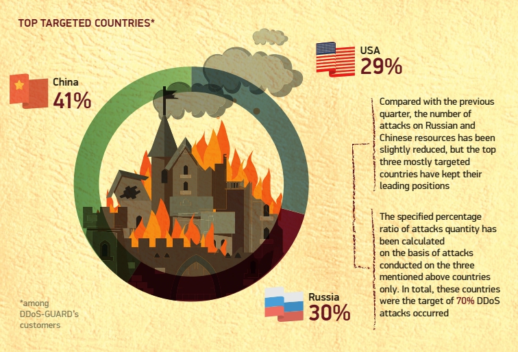 Distribution of DDoS attacks on the world map. Hosts located in China and Russia have become a bit less popular if compared to the previous quarter, but the TOP-3 leaders remained the same*: