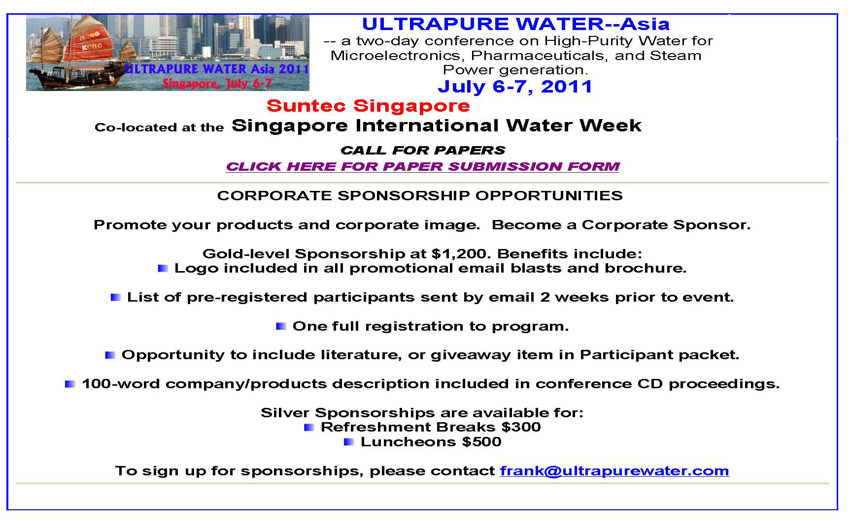 ULTRAPURE WATER Asia 2011 is slated for July 6-7 in Singapore. The meeting will be co-located at the annual Singapore International Water Week that is being held that week at the Suntec Exhibition Centre. Technical papers will focus on water treatment issues in the semiconductor, pharmaceutical, and power generation industries. Abstracts are still being accepted. A form to submit abstracts is available at http://www.ultrapurewater.com/Conferences/PDF/CallForPapersAsia2011.pdf.