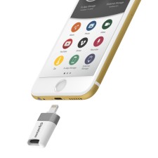 - The Gigastone CR8600 is then inserted into an iPhone or iPad via its Apple Lightning adapter.