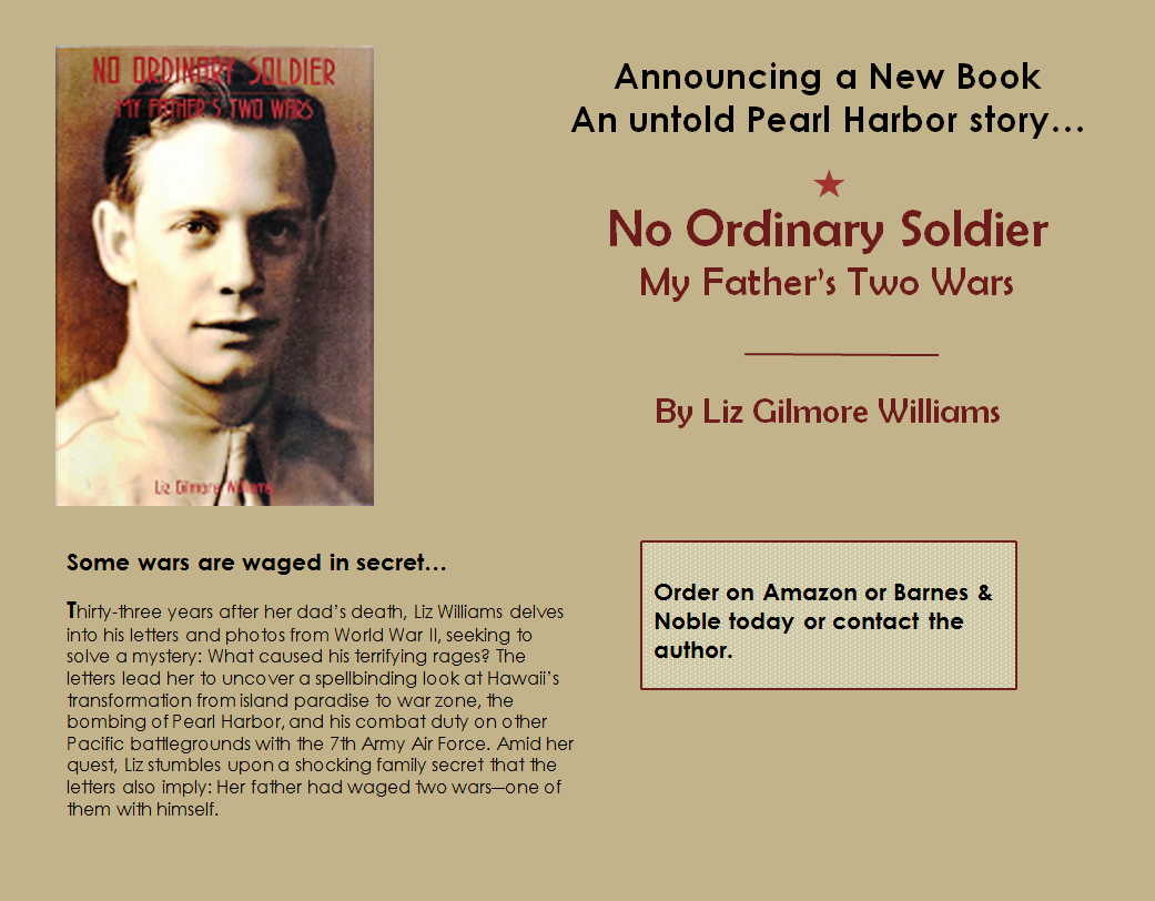 Indian Land, SC, April 12, 2017 (Newswire.com) - Thirty-three years after her dad’s death, author Liz Gilmore Williams delves into his letters and photos from World War II, seeking to solve a mystery: What caused his terrifying rages? She’d never considered his surviving the attack on Pearl Harbor. The letters lead her to uncover a spellbinding look at Hawaii’s transformation from island paradise to war zone, the bombing of Pearl Harbor, and his combat duty on other Pacific battlefields. Amid her quest, Liz stumbles upon a shocking secret that the letters also imply: Her father had waged two wars―one of them with himself.
