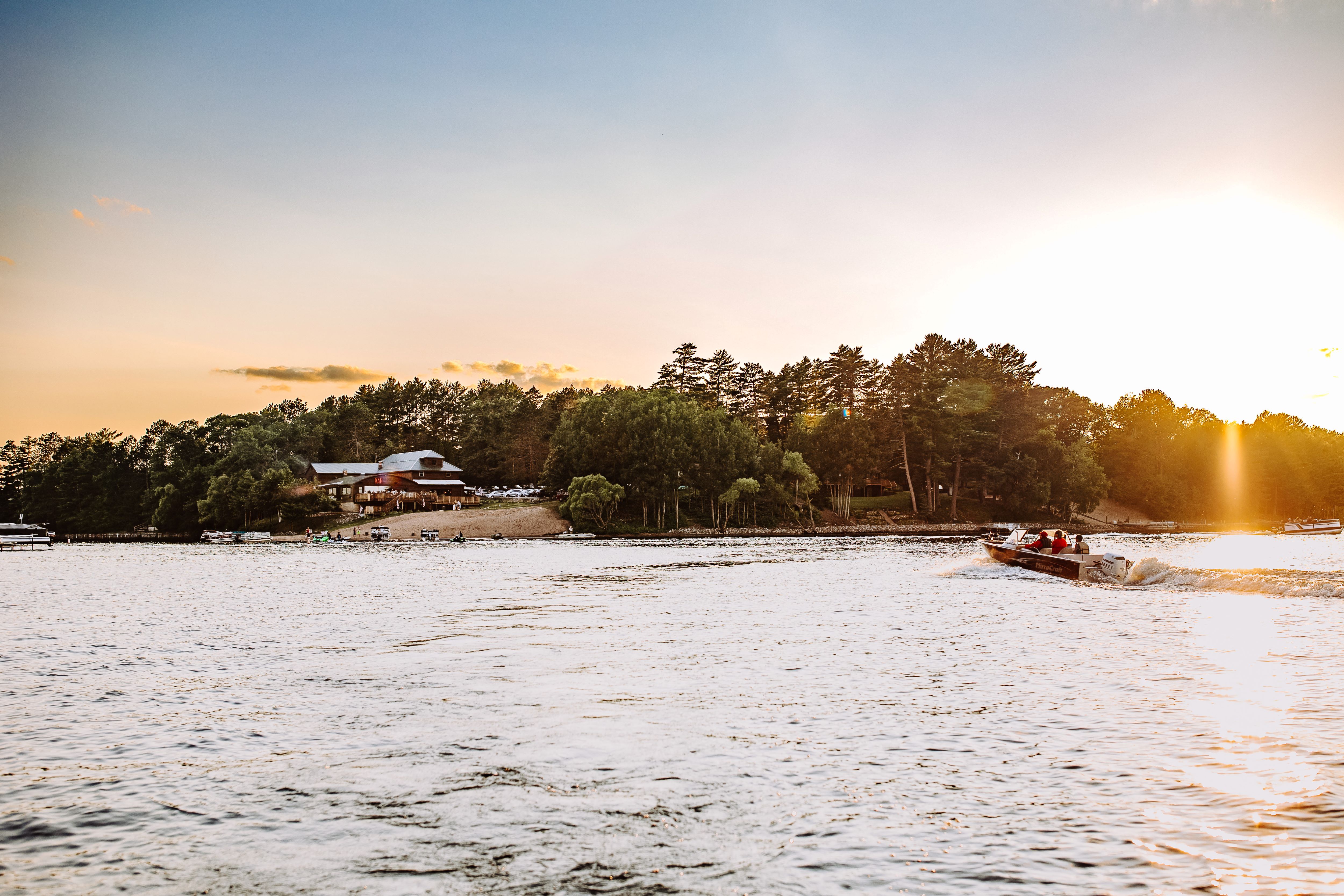 In addition to hosting travelers, Bootleggers Lodge is the perfect location for extraordinary weddings and events. The vintage character, rustic barnwood flooring and exposed beams, stunning chandeliers, and historic details throughout the restaurant and Lodge come together to create a truly spectacular setting. The G5 Baby Bootlegger, a classic Chris-Craft wood boat often dons the beach for a perfect photo op, alongside boaters who pull up to enjoy the beach, bar or restaurant. For your event, Bootleggers can accommodate everything from a large wedding celebration, to private dining or private suite-style set up for a small party to watch a big game, hold a board meeting or an intimate dinner. With a unique layout able to accommodate groups large and small, it serves as a beautiful venue for weddings, corporate meetings, and special events, and a remarkable spot to celebrate milestones.