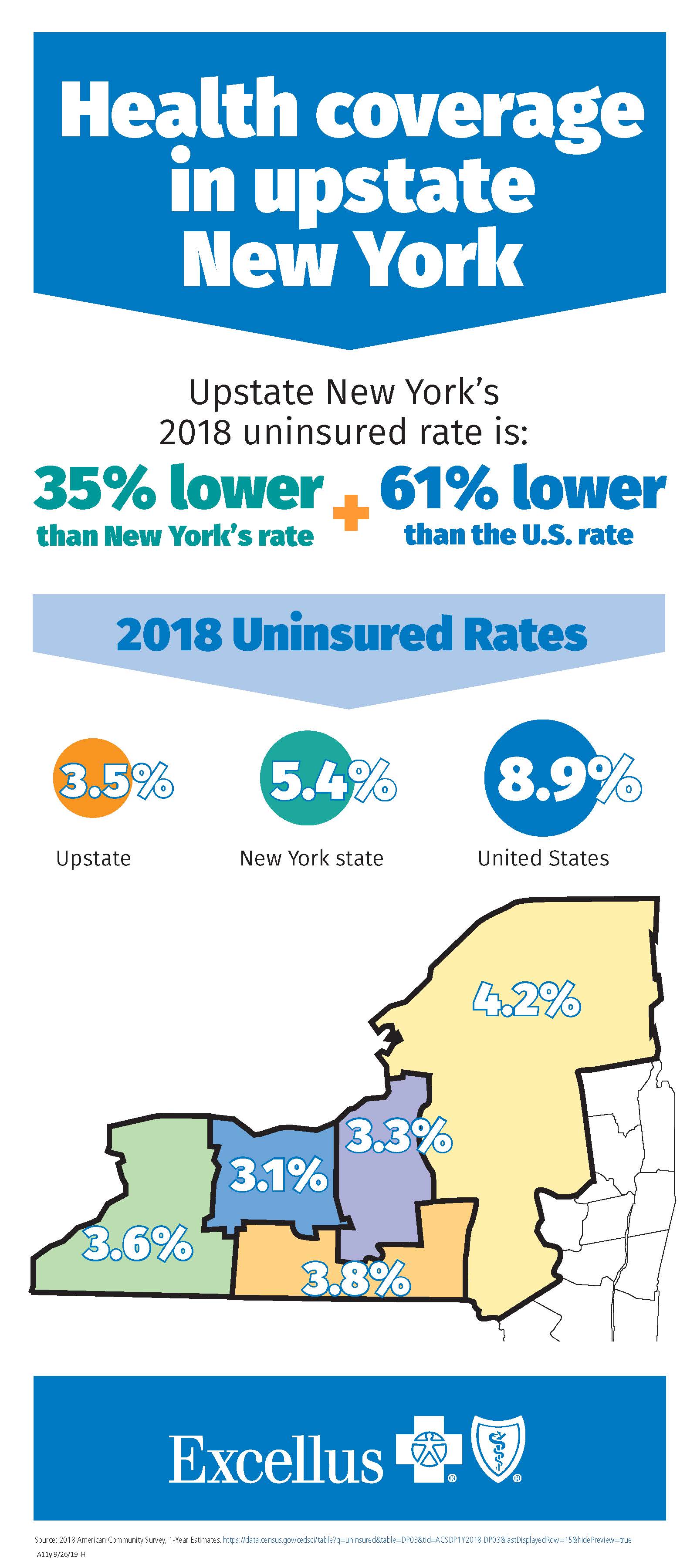ROCHESTER, N.Y., September 26, 2019 (Newswire.com) - Upstate New York’s health insurance uninsured rate fell to 3.5 percent, the lowest ever recorded, according to Excellus BlueCross BlueShield’s analysis of the U.S. Census Bureau’s 2018 American Community Survey issued today.