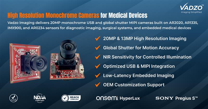 FORT WORTH, Texas, April 17, 2026 (Newswire.com) - Vadzo Imaging, a provider of embedded vision camera products and OEM imaging solutions, is introducing its high resolution monochrome camera portfolio for medical devices, built on advanced sensors including onsemi HyperLux AR2020, onsemi AR1335, Sony Pregius S IMX900, and onsemi AR0234. The portfolio is designed to support a wide range of medical imaging applications, combining high-resolution image capture, global shutter performance, and reliable low-light imaging across both diagnostic and embedded medical systems.