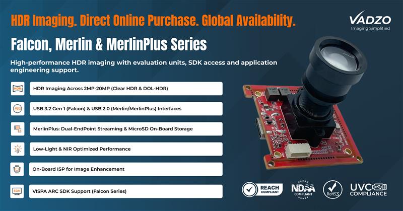 FORT WORTH, Texas, March 25, 2026 (Newswire.com) - Vadzo Imaging, a global provider of embedded and industrial vision cameras, today announced that its complete HDR USB camera portfolio included in the Falcon USB 3.2 Gen 1 UVC camera series, Merlin USB 2.0 UVC camera series, and MerlinPlus USB 2.0 UVC camera series with on-board storage, is available for direct online purchase at vadzoimaging.com with no minimum order quantity and fast international shipping to the US, Canada, UK, Europe, and other markets worldwide.