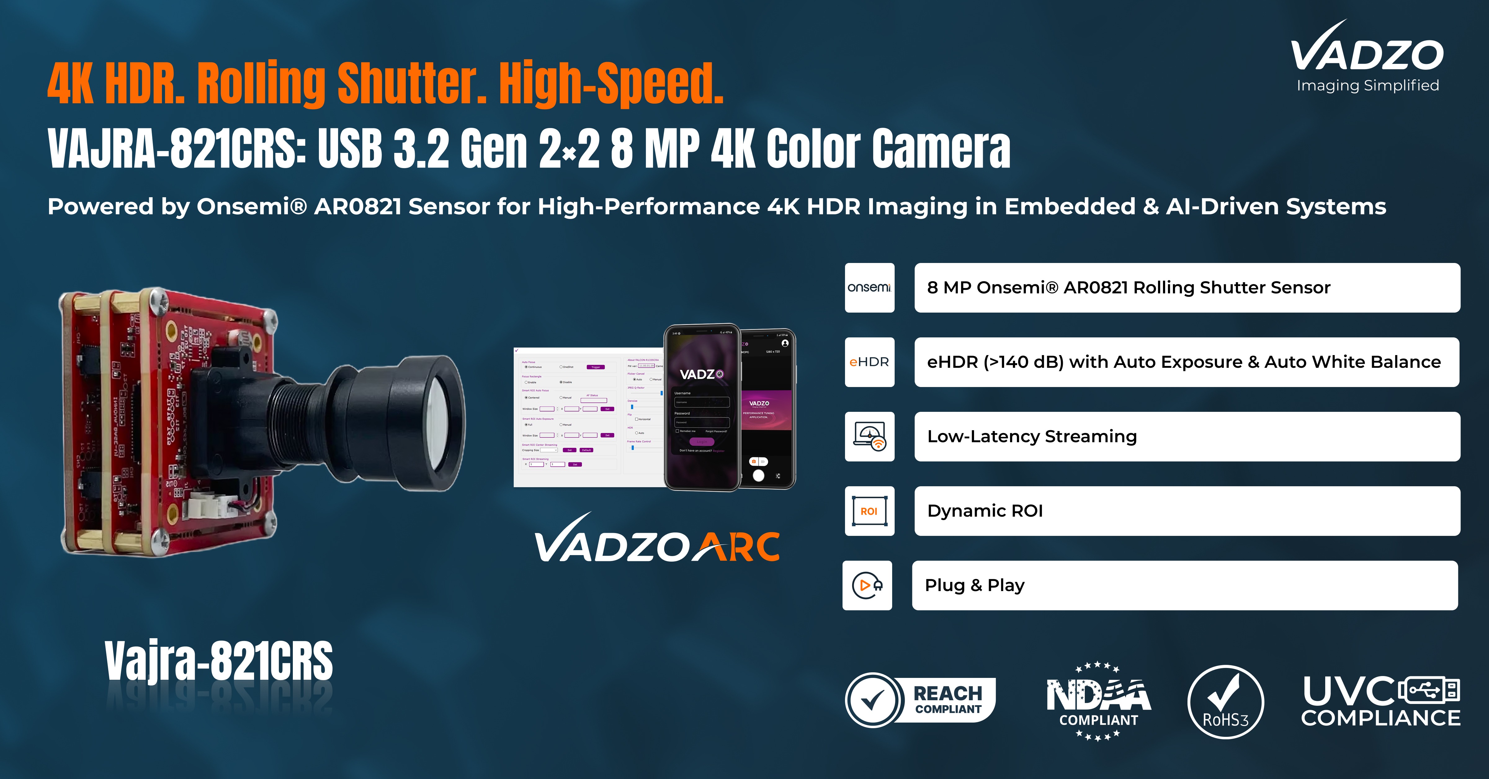 The Vajra-821CRS 4K HDR USB 3.2 Gen 2×2 camera is available for OEM evaluation and production deployment. Engineering samples, development support, and detailed technical documentation are available through Vadzo Imaging.