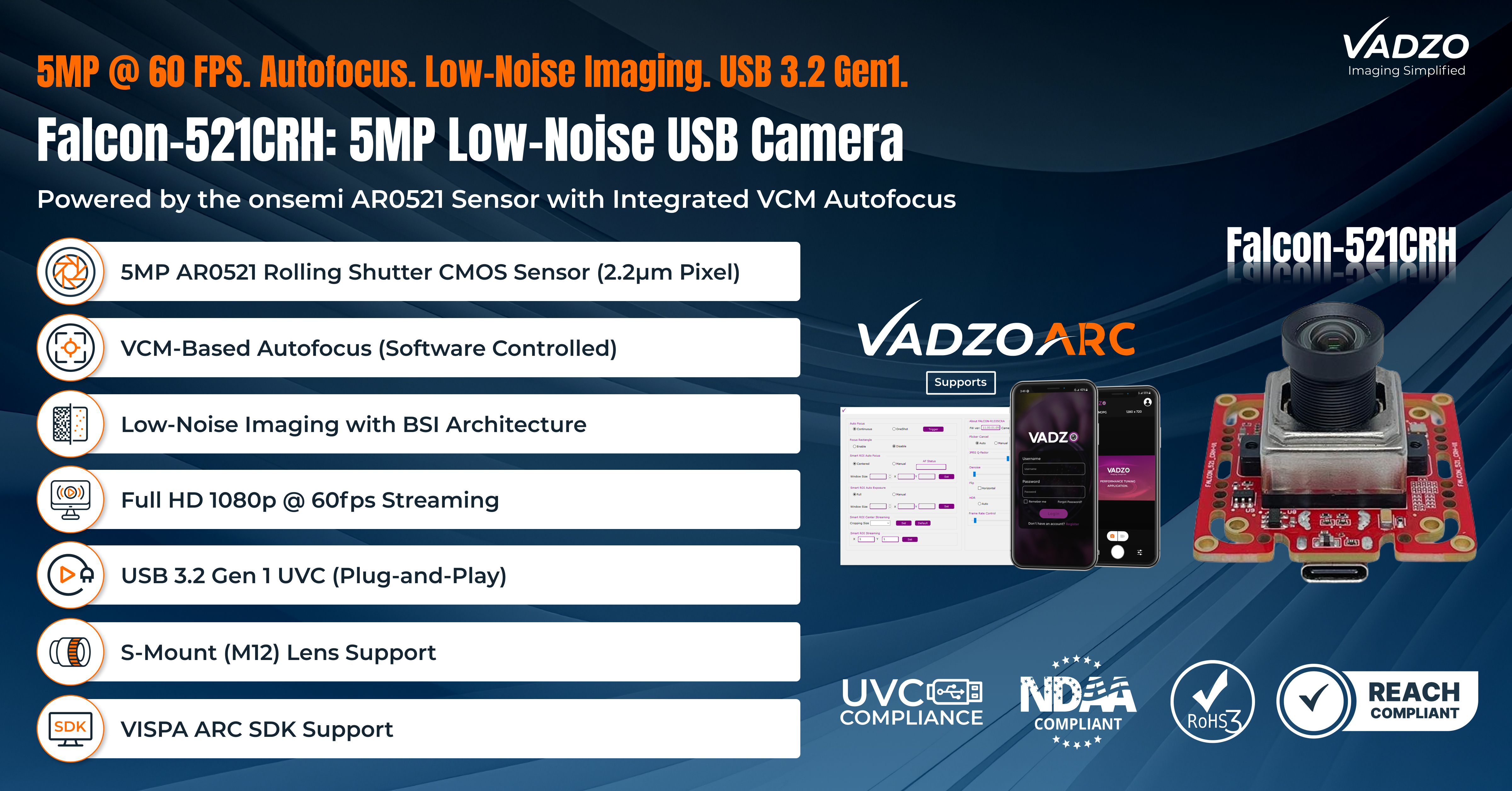 FORT WORTH, Texas, March 26, 2026 (Newswire.com) - Vadzo Imaging today announced the launch of the Falcon-521CRH, the first Autofocus USB 3.2 Gen 1 UVC embedded camera to pair the Onsemi AR0521 1/2.5" BSI CMOS sensor, a 5.1MP, 60fps imaging platform built for low-light and HDR performance, with an M12 lens holder featuring an integrated Voice Coil Motor (VCM) autofocus mechanism. The combination delivers a capability previously unavailable in a single USB camera module: the large-format optical characteristics of a 1/2.5" sensor with the real-time, software-controlled focus flexibility of M12 VCM autofocus, packaged for direct integration into embedded and OEM vision systems.