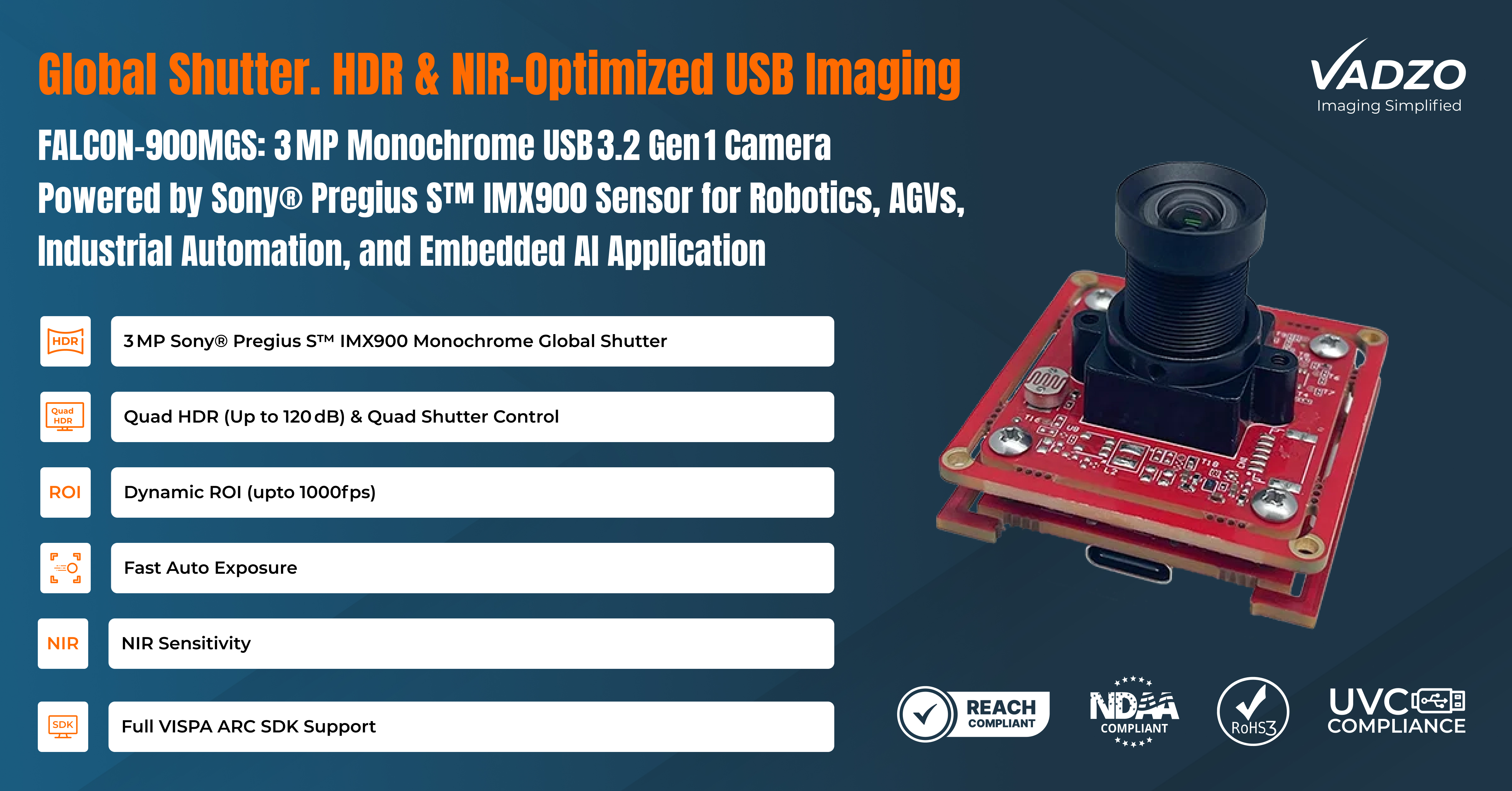 FORT WORTH, Texas, March 25, 2026 (Newswire.com) - Vadzo Imaging, a global leader in embedded vision, today announces the launch of the Falcon‑900MGS, a 3.2MP monochrome global shutter USB 3.2 Gen 1 camera built on the Sony® Pregius S™ IMX900. The IMX900 sensor is Sony's fourth-generation stacked global shutter CMOS sensor, which makes the Falcon‑900MGS genuinely distinctive: It combines true global shutter, quad HDR up to 120 dB, and enhanced NIR sensitivity in a single compact USB module. For embedded vision developers, industrial automation engineers, and robotics and UAV OEMs, the Falcon‑900MGS delivers a level of imaging versatility in a plug-and-play USB camera that was previously only accessible in larger, more complex machine vision systems.