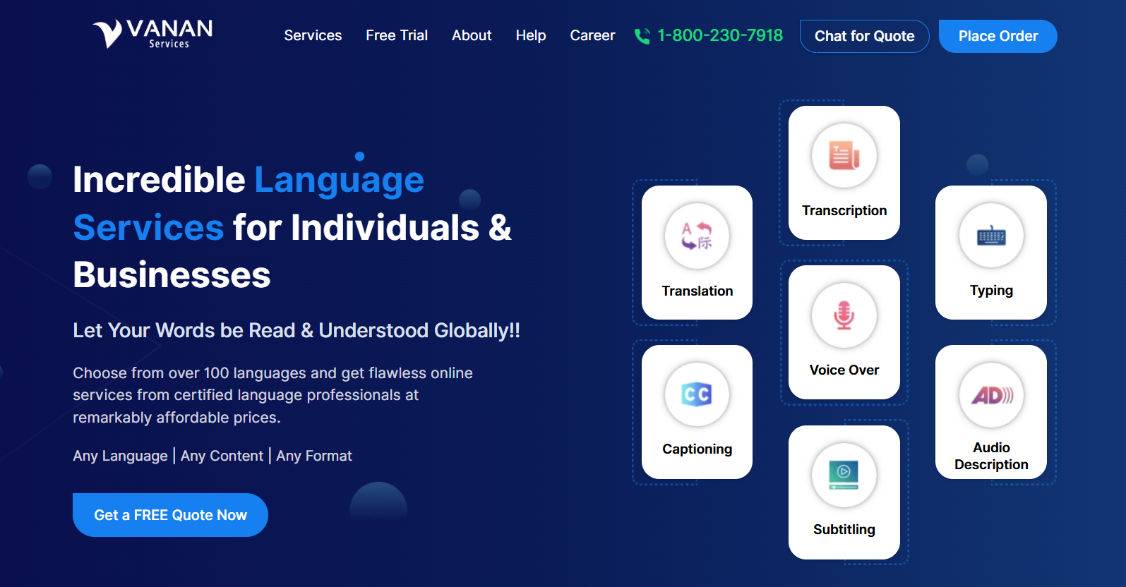 Vanan Services is a U.S.-founded translation company serving individuals, businesses, and government agencies nationwide and abroad. With expertise in over 100 languages, Vanan offers certified translations, transcription, voiceover, closed captioning, and subtitling services. Known for accuracy, speed, and customer support, Vanan makes communication across languages simple and reliable.