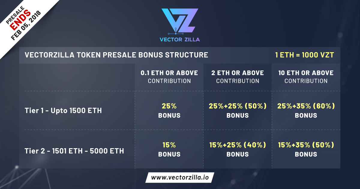 - 10 ETH = 10,000 VZT + 50% Bonus (15,000 VZT)