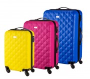 The blue suitcase measures 28” x 18.5” x 11”. The pink suitcase measures 24” x 16” x 9.5” and the yellow suitcase has the following dimensions: 20” x 13” x 8.5”.