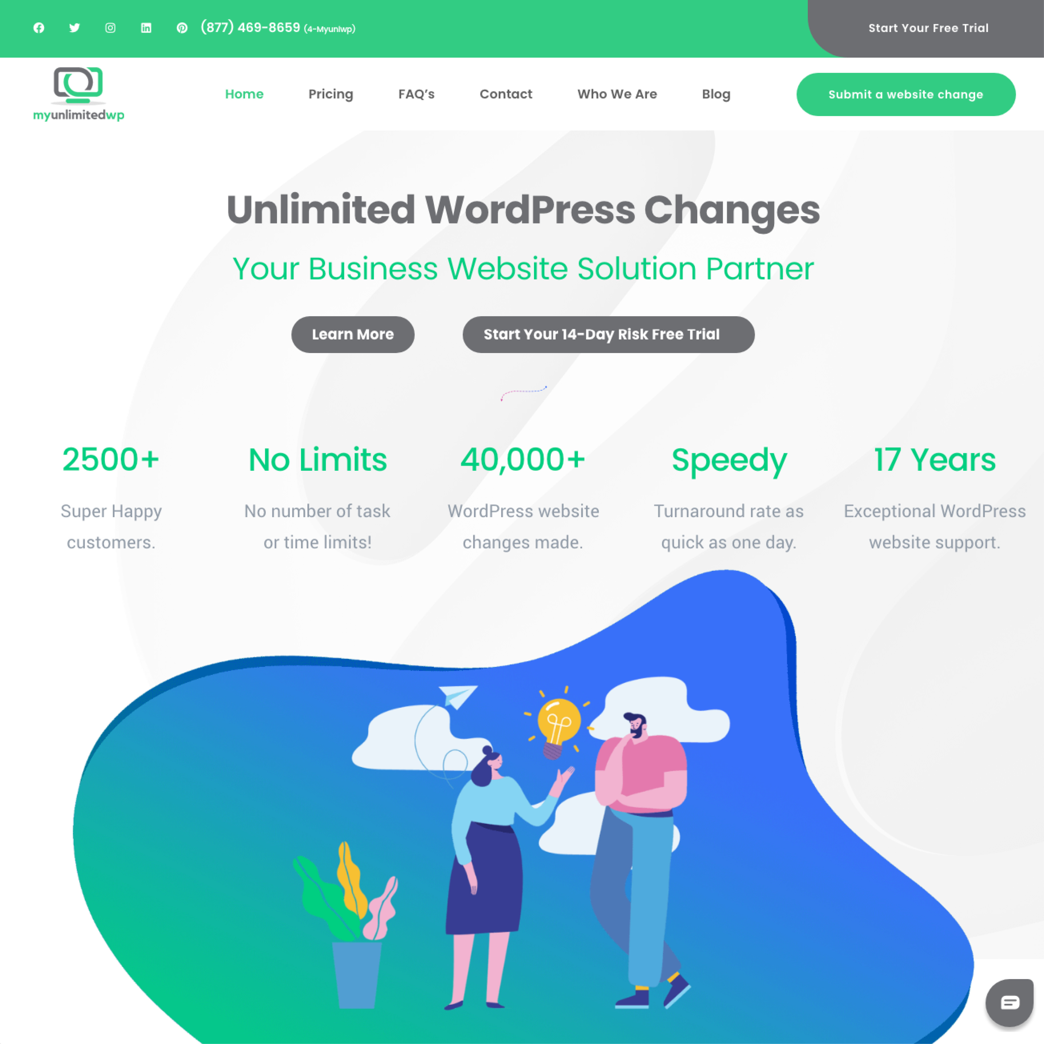 With MyUnlimitedWP, all your basic WordPress website updates and changes get done in as little as one business day. Starting at just $99 a month, with a 14-day free trial included! It really doesn’t get more awesome than that!