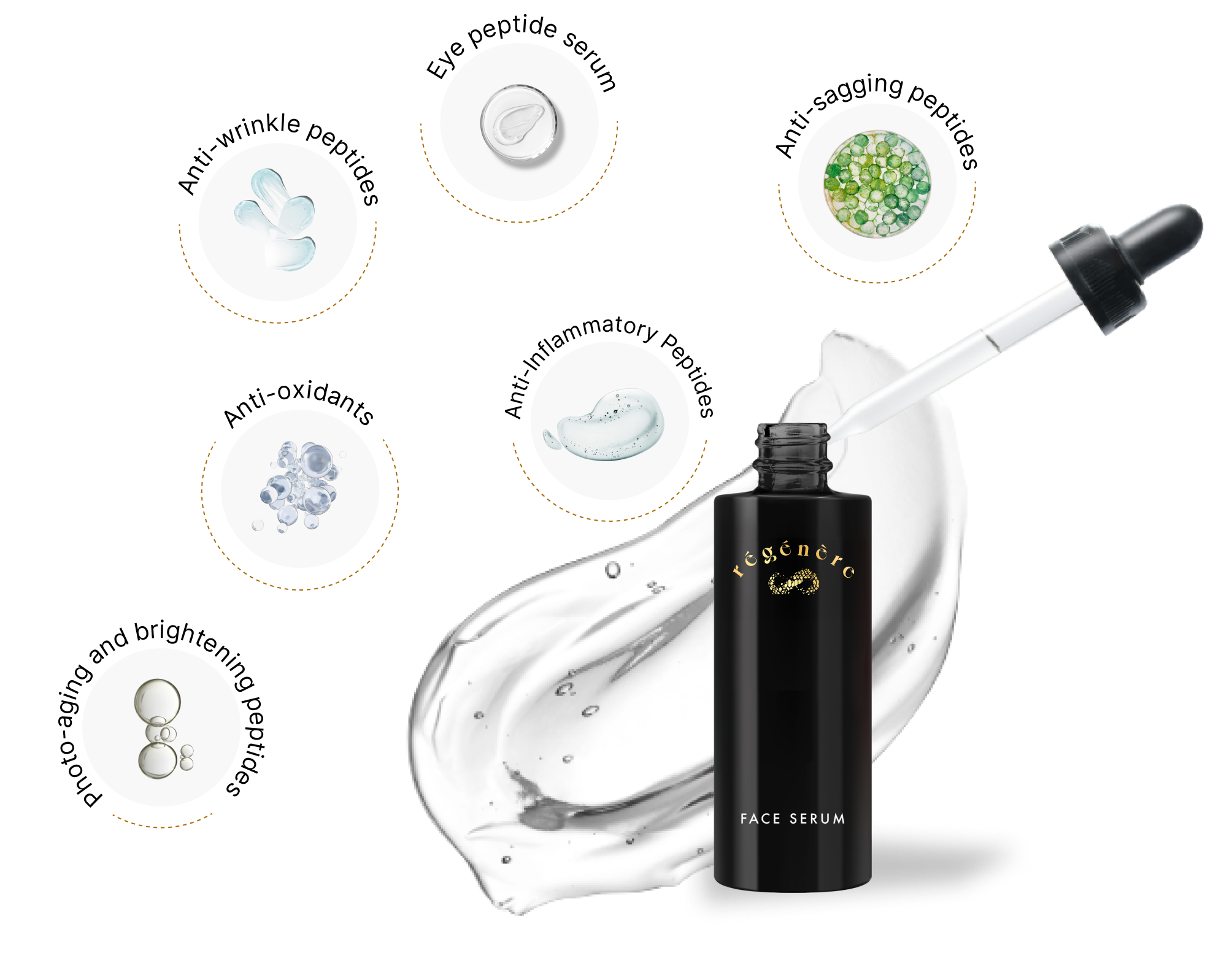 Regenere uses scientifically validated peptides, antioxidants, phospholipids, humectants, and vitamins to target five key skin-aging mechanisms.