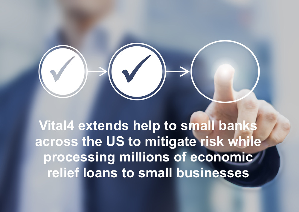 If you are a small bank or credit union facility approved to service PPP and/or EIDL loans, VITAL4 is extending this offer to you. Please contact VITAL4 through the link here https://vital4.net/contact/.