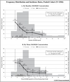 As evident from Figure 1, the higher the level of 25(OH)D, the lower the frequency of cancer. It also shows a stunning 77 percent reduction of cancer frequency when the blood concentration of 25(OH)D is above 40 ng/ml. It even showed that blood levels above 40 ng/ml have a more cancer-preventing effect.