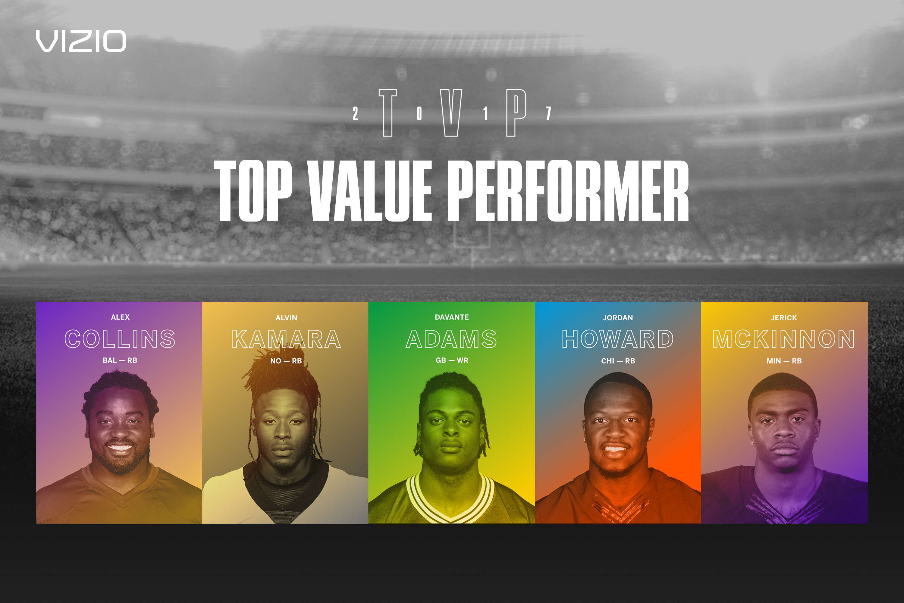 Tags: Baltimore's Alex Collins, Chicago's Jordan Howard, Green Bay's Davante Adams, Minnesota's Jerick McKinnon, New Orleans' Alvin Kamara, Top Value Performer, TVP, VIZIO