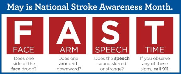 “May is National Stroke Awareness Month.” According to the National Stroke Association, nearly 800,000 people in the U.S. will have a stroke this year, one occurring every 40 seconds, and taking a life approximately every four minutes. When it comes to stroke, every second counts. Know the signs of a stroke and act F.A.S.T. (Face drooping, Arm weakness, Speech difficulty, Time to call 911) if someone is having a stroke.