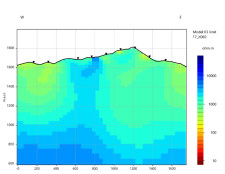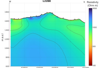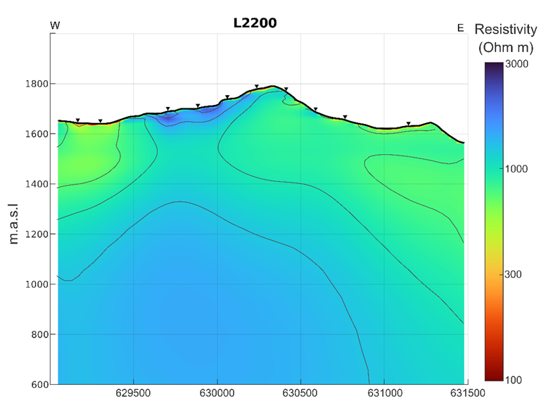 Figure 1: 3D MT resistivity cross-section (Line 2200N) modelled using Viridien's RLM-3D inversion. The prominent high-resistivity anomaly (blue zones) extends from ~1,000 m depth to surface beneath the area of known fenite dykes. This deep resistive body is interpreted as a potential carbonatite intrusion associated with REE mineralisation. (Vertical axis in metres; horizontal axis in metres along line.)