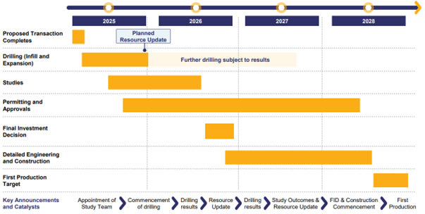 M260 plans to commence an 80,000m drilling program immediately after closing of the transaction, with kick off studies planed in 2025, a final investment decision planed in late 2026 and targeting of first gold production in 2028 (see Figure 1 below for further details).