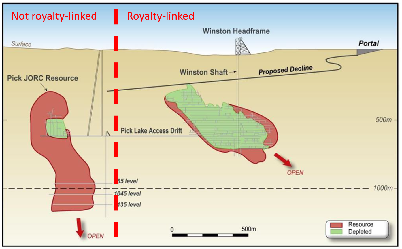 Figure 6: Superior Project - Pick Lake and Winston Lake Orebodies with the approximate royalty boundary indicated
