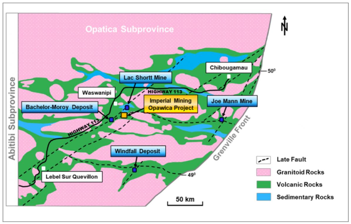 The Opawica Project is located 20km east of Desmaraisville, Québec, and consists of 42 contiguous claims covering 23km2. The Operator, Imperial Mining Group Ltd ("Imperial"), is targeting gold deposits on the major regional NE-SW and E-W deformation corridors which hosts several past producers such as Lac Shortt (2.7Mt @ 4.6 g/t Au) and Joe Mann (4.8Mt @ 7.56 g/t Au) as well as existing measured and indicated resources at Windfall (6.02Mt @ 9.6 g/t Au) and at Bachelor-Moroy (893,000t @ 5.58 g/t Au).