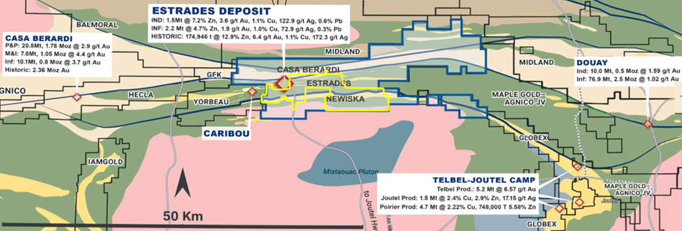 The Estrades property hosts three primary mineralized horizons - the former producing, high grade Estrades volcanogenic massive sulphide ("VMS") mine where all the current resources are located, the Newiska VMS horizon to the south, and the Casa Berardi horizon (gold target) to the north. The Estrades Deposit contains an indicated resource of 1.5Mt @ 7.2% Zn, 3.6 g/t Au, 1.1% Cu, 122.9 g/t Ag and 0.6% Pb as well as an inferred resource of 2.2Mt @ 4.7% Zn, 1.9 g/t Au, 1.0% Cu, 72.9 g/t Ag and 0.3% Pb.